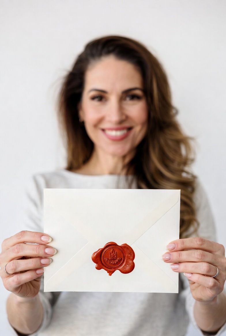 A smiling woman with wavy brown hair holds up a white envelope sealed with a red wax stamp. She wears a light gray sweater and stands against a plain white background. Her hands are visible, showing neatly manicured nails.