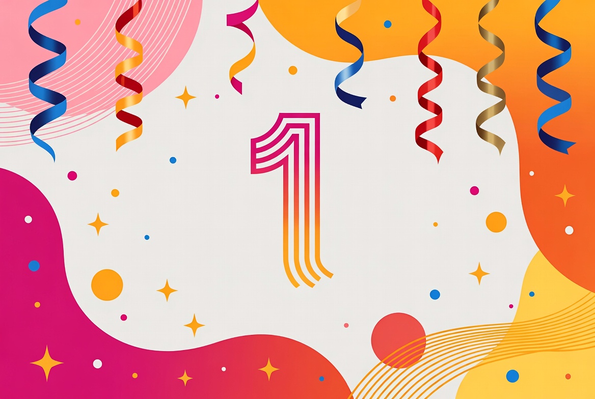 A large golden number 1 with pink and yellow gradient stands prominently on a white background. It is surrounded by vibrant multicolored streamers, confetti dots, and sparkling stars in pink, orange, blue, and gold. The design features curved abstract shapes and festive elements.