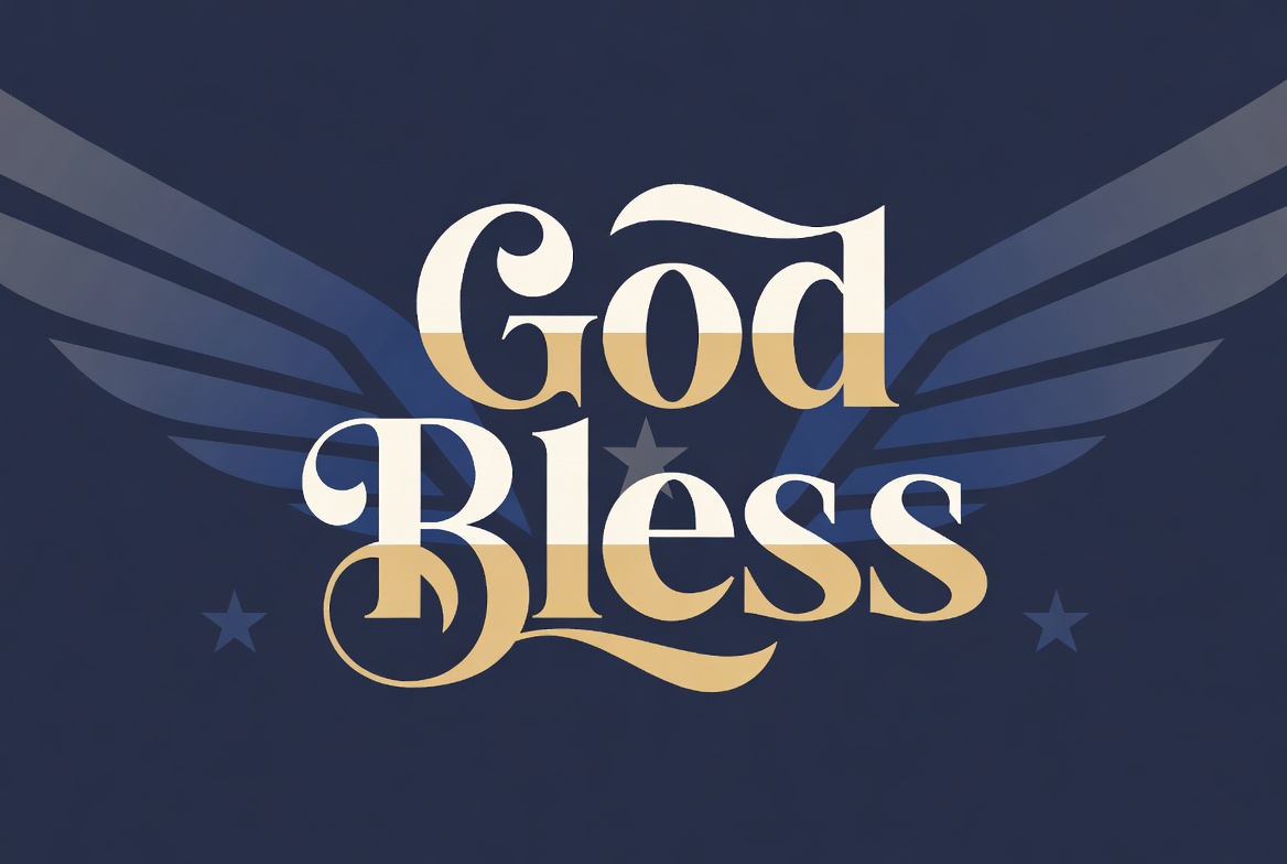 Bold gold text reading 'God Bless America' on a dark blue background. Stylized wings extend from the letters, with white stars accenting the design. The graphic features a patriotic theme with elegant typography.