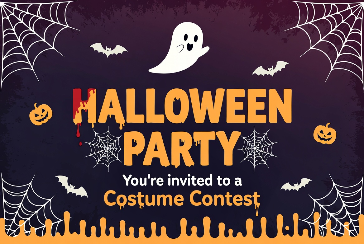 A Halloween party invitation features bold orange 'Halloween Party' text with dripping blood effects. It includes cartoon ghosts, bats, pumpkins, and spider webs on a dark purple background. The text 'You're invited to a Costume Contest' is centered below the main title.