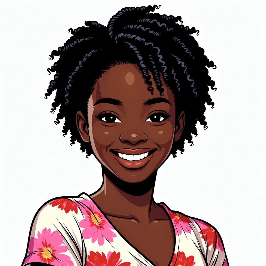 A vibrant illustration of a young African-American woman with tight curly black hair smiles warmly at the viewer. She has smooth dark skin, expressive brown eyes, and full lips. She wears a floral dress with pink flowers on a white background.