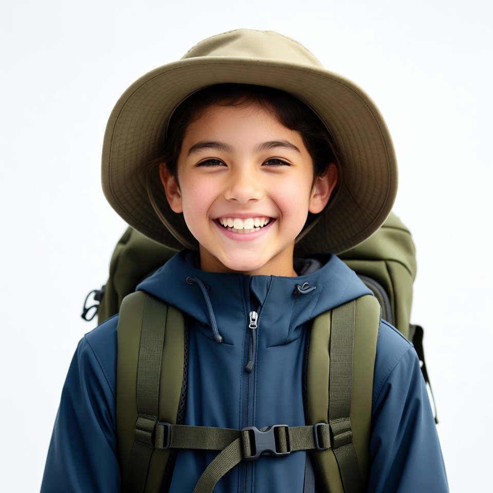 Asian, adventure, backpack, child, green backpack, happy, hat, hooded jacket, isolated background, khaki hat, male, navy jacket, outdoor gear, smiling, wide-brim hat, young boy, boy