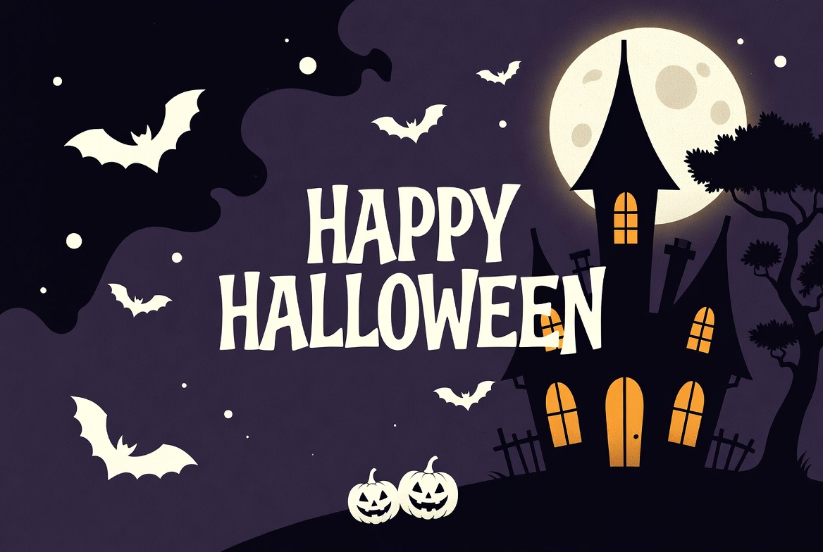 A vibrant Halloween illustration features a tall haunted castle on a hill under a full moon. Flying bats surround the scene, with jack-o-lantern pumpkins in the foreground and spooky trees nearby. Bold 'Happy Halloween' text is centered prominently.