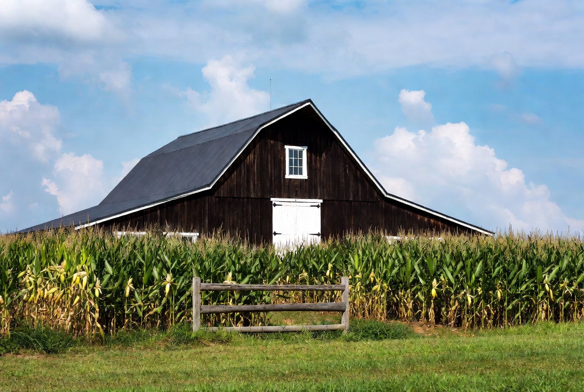 agriculture, blue sky, clouds, corn farm, corn stalks, cornfield, countryside, farm building, farmhouse, field, harvest, landscape, red barn, rural, scenery, shingled roof, white doors, wooden barn, wooden fence, barn