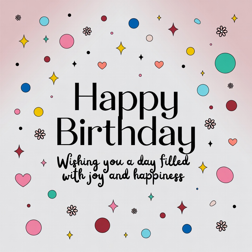 A colorful digital illustration features the text 'Happy Birthday Wishing you a day filled with joy and happiness' centered on a light pink background. Surrounding the text are scattered hearts, stars, flowers, and multicolored dots and circles in various sizes. The design is festive and celebratory with vibrant elements like blue, green, yellow, and red accents.
