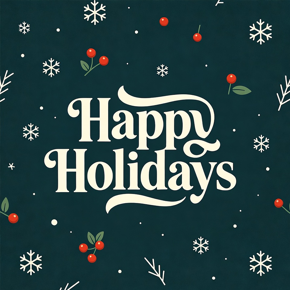 Christmas, branches, cherries, clipart, cursive text, festive background, green leaves, holiday greeting, holidays, holly berries, illustration, isolated background, navy background, red cherries, snow, snowflakes, white text, winter, happy holidays