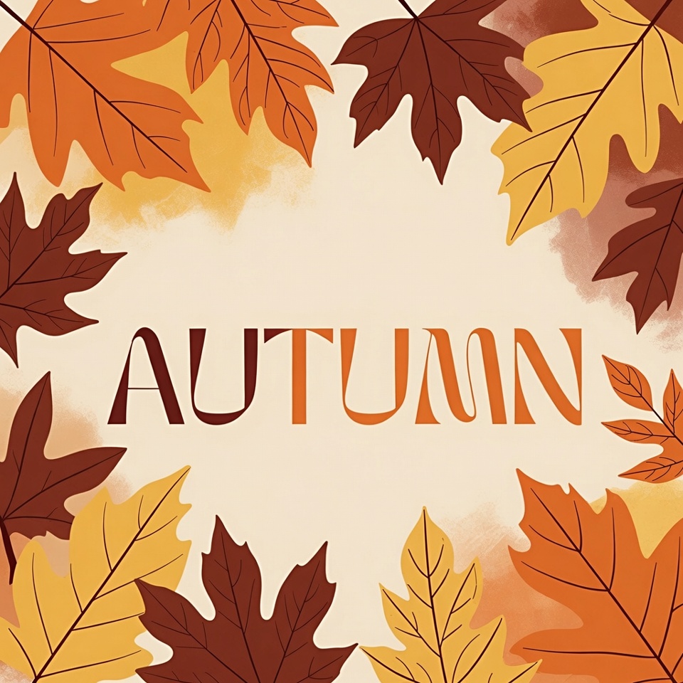 A vibrant illustration features scattered orange, yellow, and red autumn leaves on a light beige background. Bold, stylized text reading 'AUTUMN' is centered among the leaves. The design has a soft, watercolor-like texture with leaves overlapping the edges.