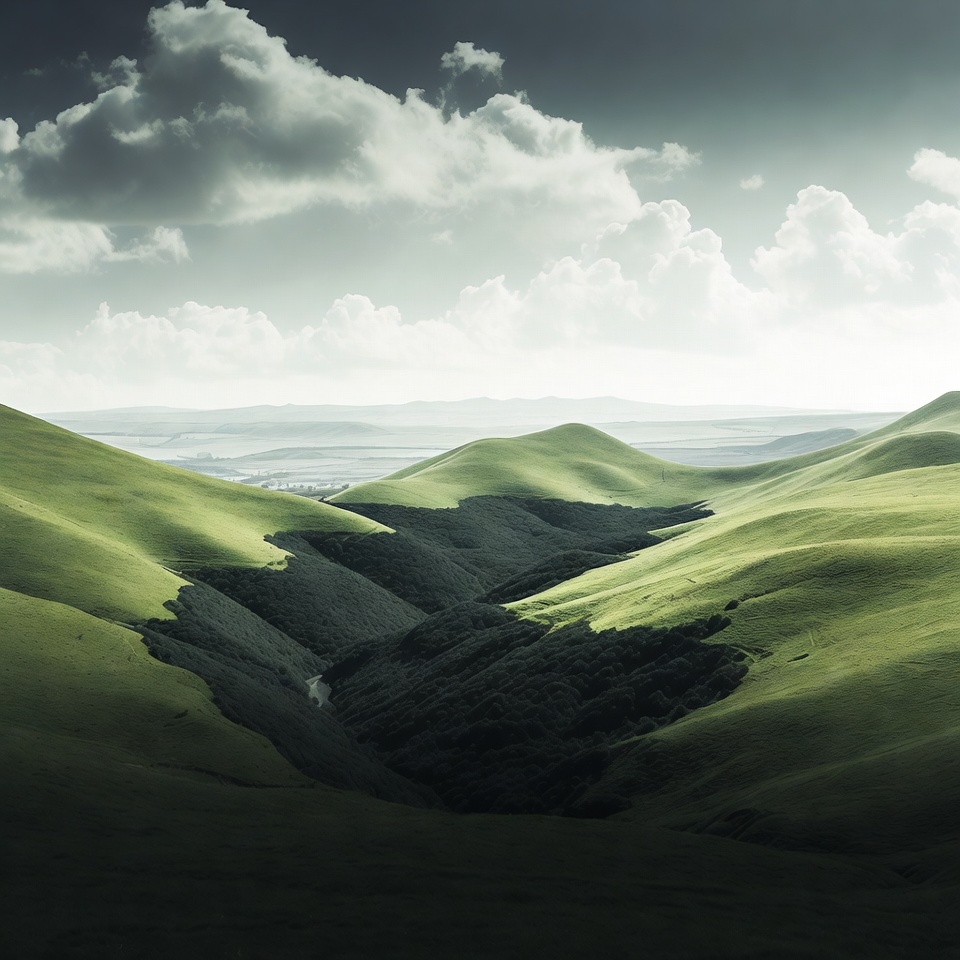 Green Rolling Hills Under Stormy Clouds