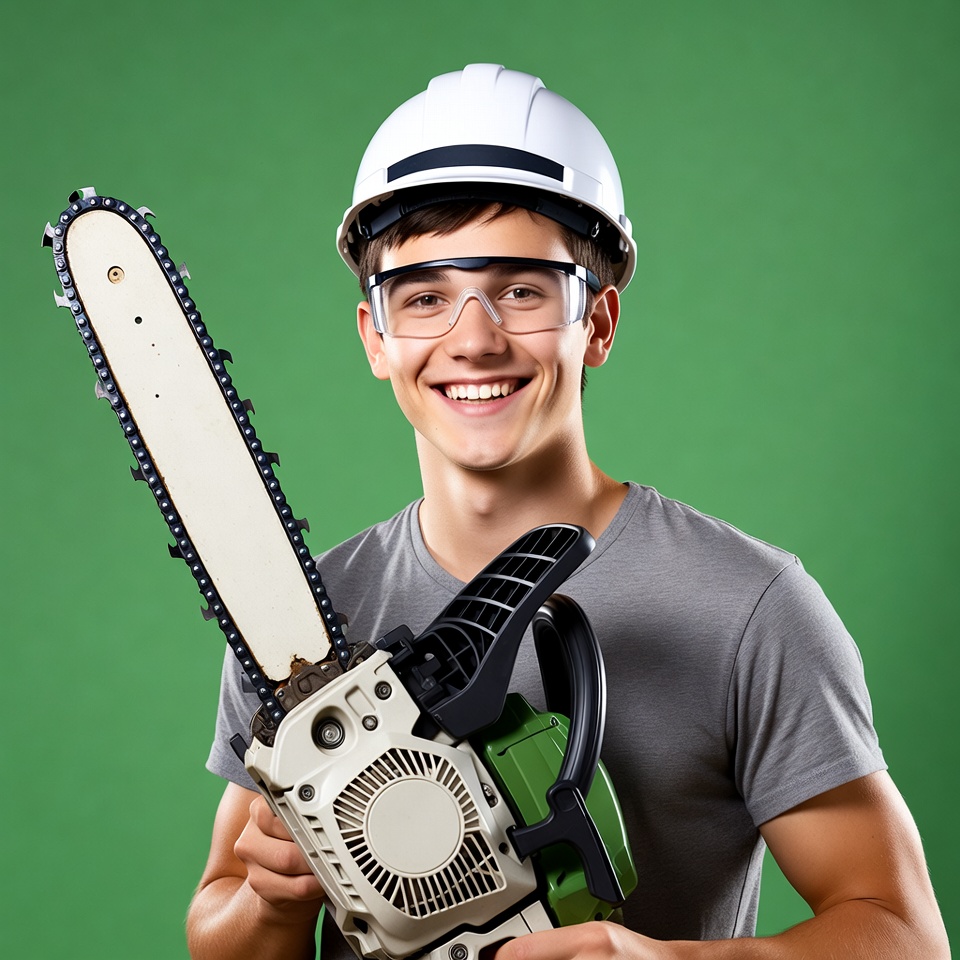 A young man with short dark hair smiles while holding a large chainsaw over his shoulder against a green background. He wears a white hard hat, clear safety glasses, and a gray t-shirt. The chainsaw features a green body, white bar, and black handle.