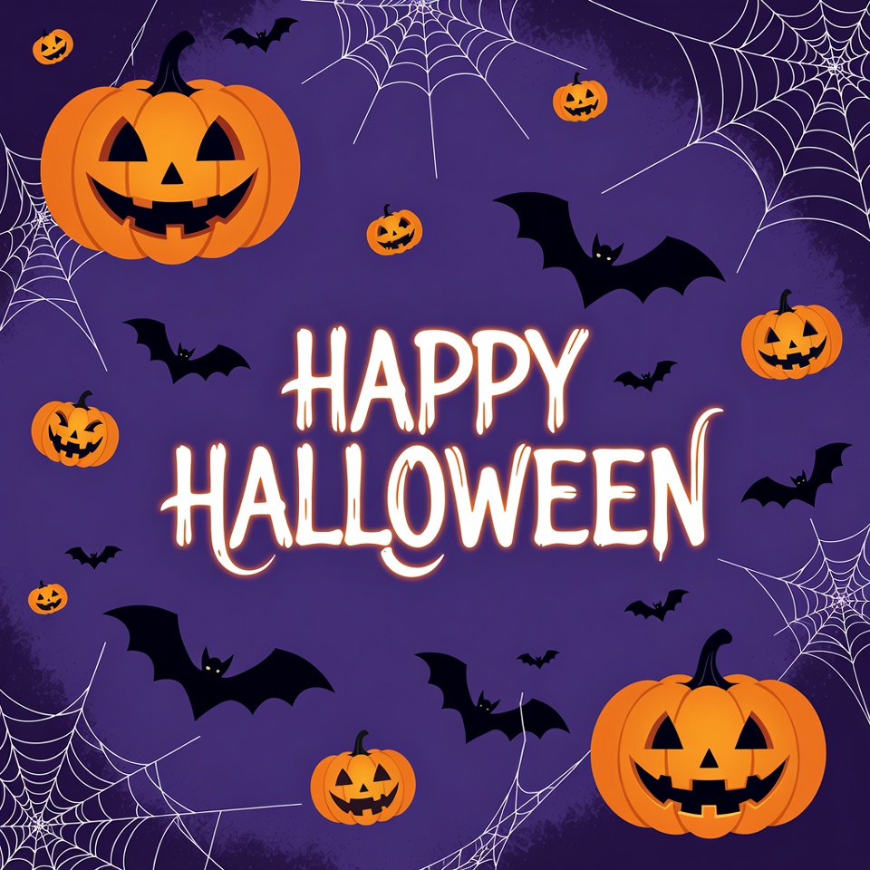 A vibrant purple Halloween illustration features floating jack-o'-lantern pumpkins with carved faces, black bats, and spider webs. Bold glowing text reads 'Happy Halloween' in the center. The design uses a dark background with scattered Halloween elements for a festive look.