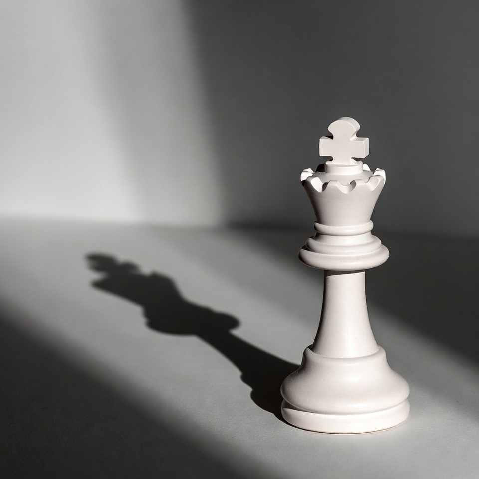 A white chess king piece stands on a flat surface with a dramatic elongated shadow cast beside it. The king features a detailed crown and cross on top, rendered in glossy plastic. Soft lighting creates a high-contrast scene against a plain gray background.