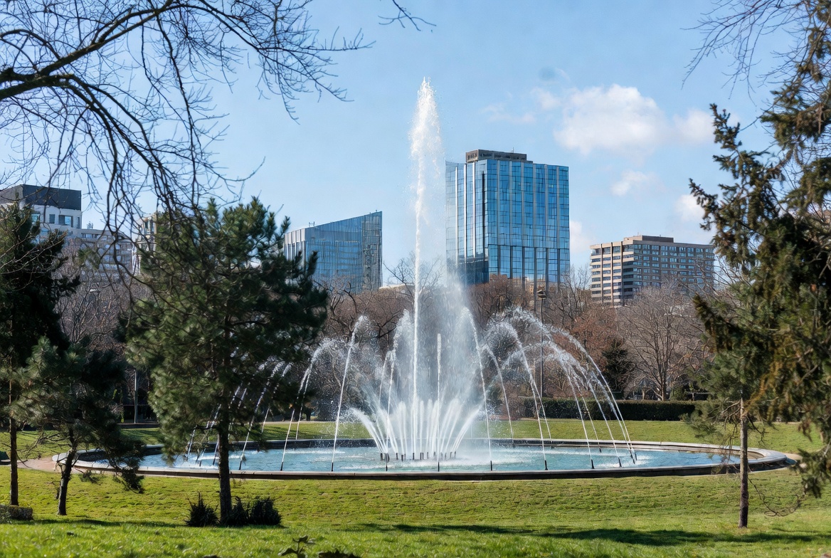 bare trees, blue sky, circular fountain, cityscape, clouds, evergreens, glass buildings, grass, green grass, modern buildings, park, pool, skyscrapers, trees, urban park, water fountain, water spray, fountain