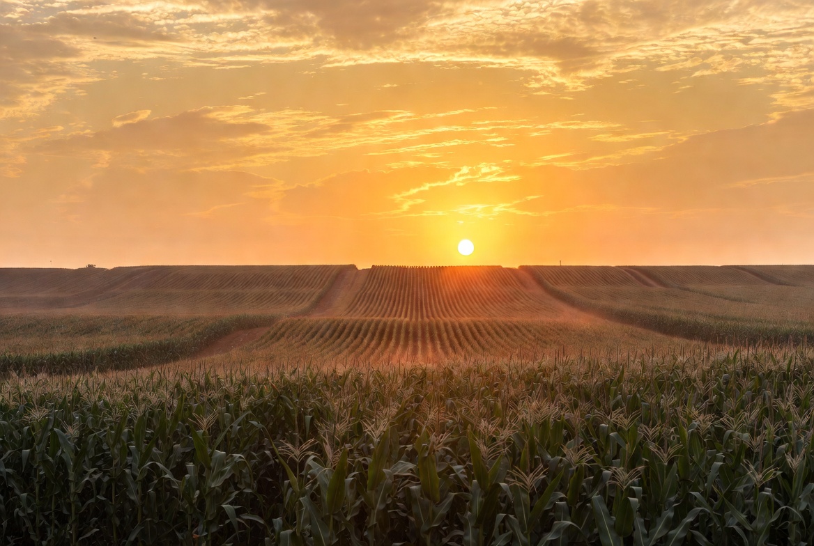 A vibrant sunset illuminates rows of tall corn fields stretching across the landscape. The sun hangs low on the horizon, casting golden light over the green maize plants and distant fields. Wispy clouds fill the orange and yellow sky.