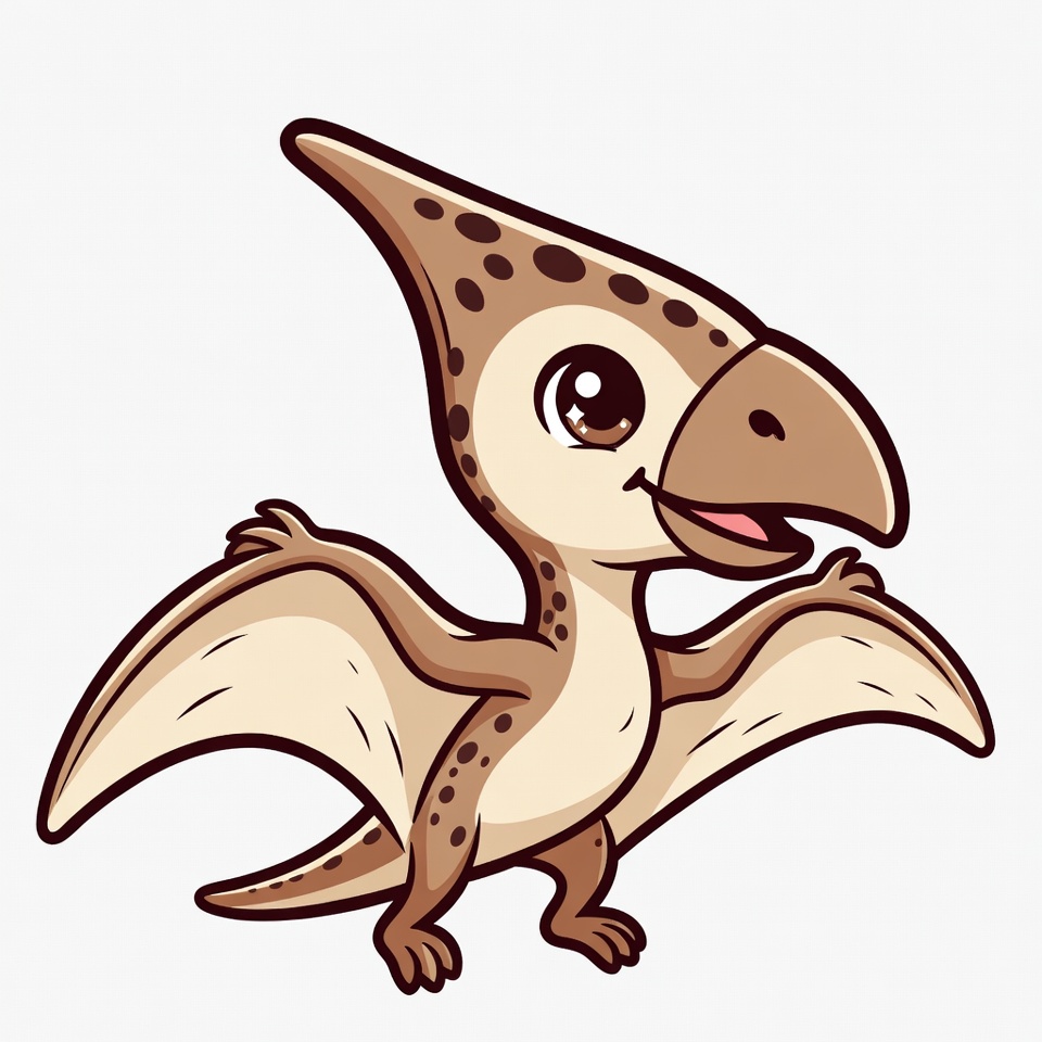 A kawaii-style cartoon pterodactyl with large sparkling eyes and a smiling mouth stands on a white background. It features brown spotted skin, wide beige wings, and a long tail. The illustration has bold black outlines and playful proportions.