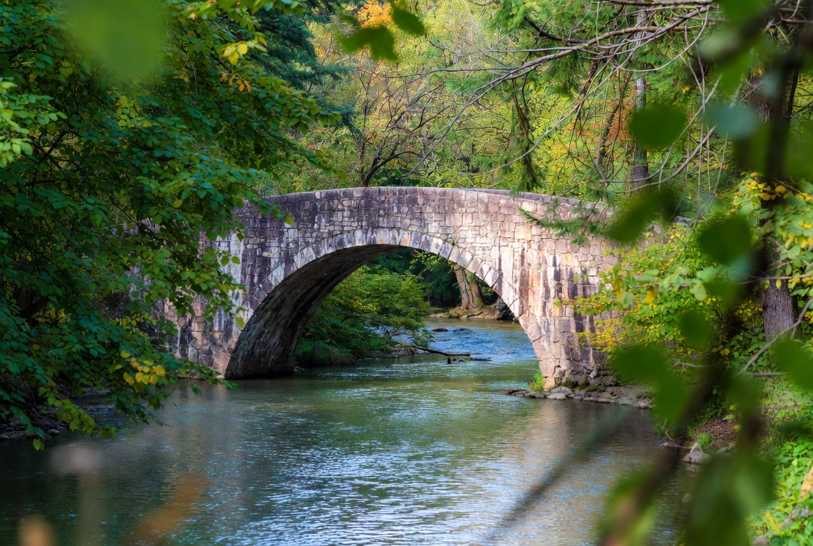 arch bridge, arched structure, autumn leaves, bridge over water, calm river, environment, fall colors, foliage frame, forest, green foliage, greenery, historic bridge, landscape, nature, outdoor, pathway, river, scenic, stone arch, stream, trees, woodland, woods, yellow leaves, stone bridge