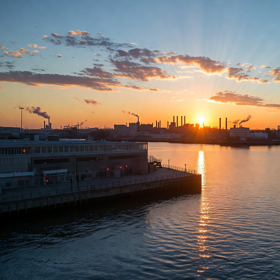 Industrial Factories at Sunset over Harbor