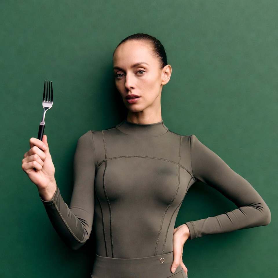 White, bun hairstyle, confident pose, female, fork, gray bodysuit, green background, hand on hip, high neckline, holding fork, isolated background, long sleeve, slim figure, studio photo, woman