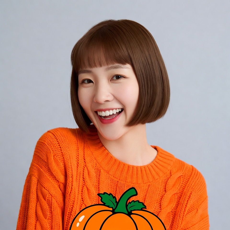A smiling Asian woman with straight brown bob haircut and bangs wears an orange knit sweater featuring a large cartoon pumpkin. She stands against a light gray background, showing a joyful expression with red lips. The pumpkin design on her sweater has green stem and details.