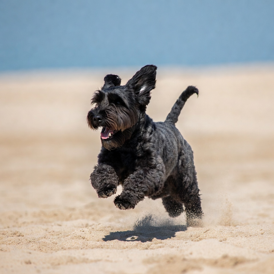animal, beach, black dog, blue sky, canine, curly dog, fluffy fur, isolated background, motion, ocean, paws, pet, running dog, sand, schnauzer, small dog, tongue out, dog