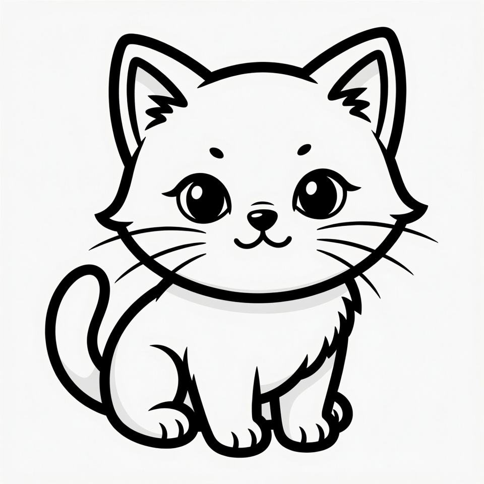 A black and white line drawing of a cute kitten sitting with its tail curled around. The kitten has large expressive eyes, fluffy fur details, and a smiling mouth. It is depicted in a simple cartoon style on an isolated white background.