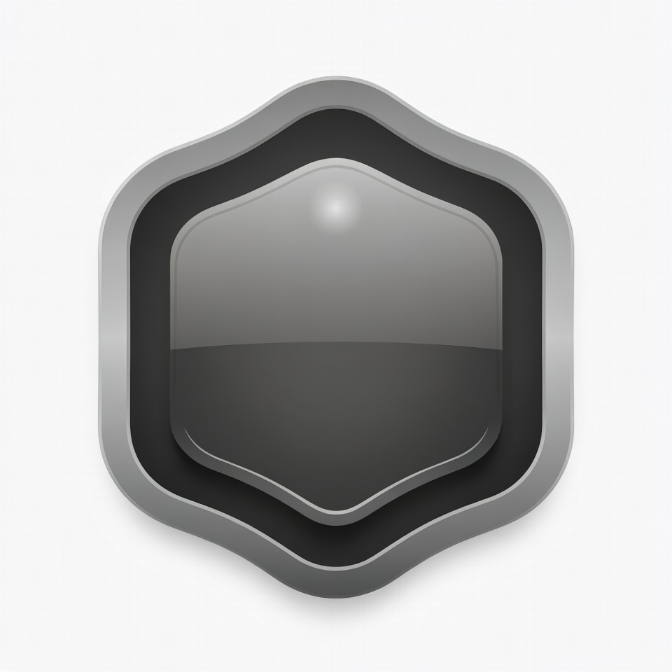 A glossy gray hexagonal shield with a scalloped edge is centered on a white background. It features metallic silver borders and a reflective black center. The design appears as a 3D vector illustration.