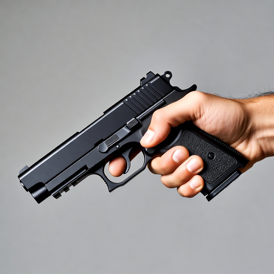 black pistol, close-up, defense, firearm, gray background, grip, gun, holding gun, isolated background, male hand, man's hand, matte black, pistol, rail, semi-automatic, shooting, slide, trigger, weapon, handgun