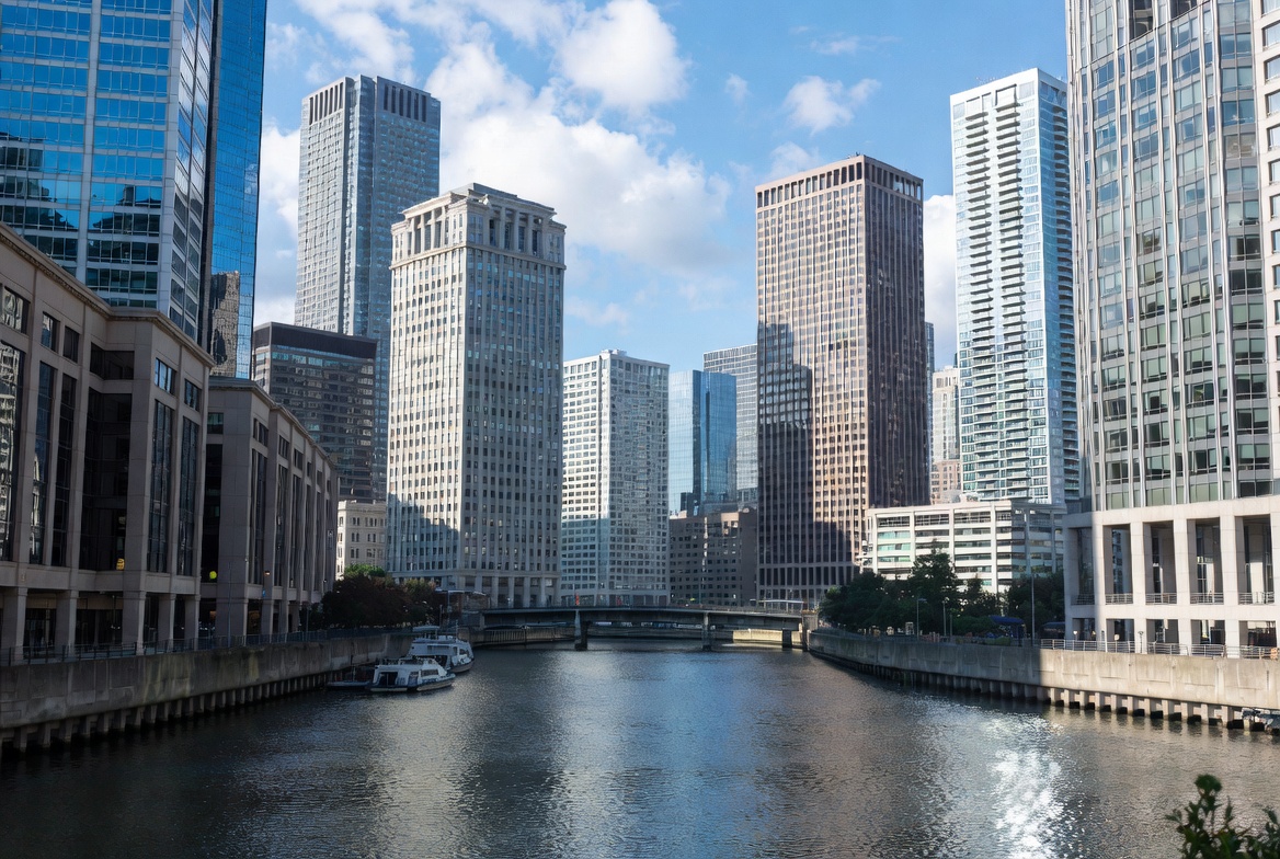 architecture, blue sky, boats, bridge, cityscape, cloudy sky, concrete embankments, downtown, glass towers, modern buildings, river, skyscrapers, tall buildings, urban, water, waterfront, Chicago River