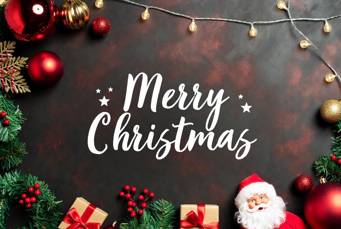 A festive flat lay features the text 'Merry Christmas' in elegant white script on a dark textured background. Red and gold Christmas ornaments, fairy lights, holly branches, and red ribboned gift boxes surround the text. A small plush Santa Claus figurine sits in the corner amid the holiday decorations.