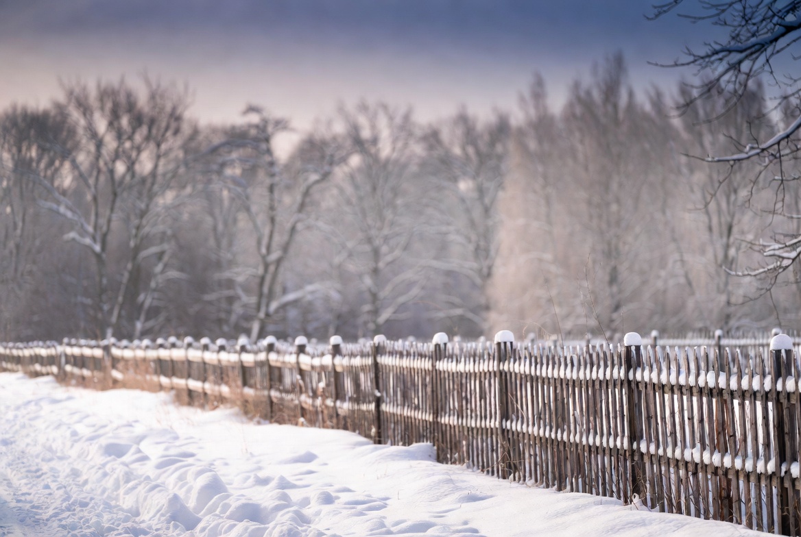 A wooden fence covered in snow runs alongside a snowy path through a birch forest. Bare trees with white branches stand in the blurred background under a pale blue sky. Fresh snow blankets the ground, creating a serene winter landscape.
