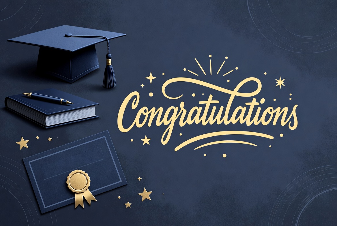 achievement, celebration, clipart, congratulations text, diploma, gold seal, gold tassel, graduate, illustration, isolated background, mortarboard, navy blue background, notebook, pen, sparkles, stars, swirls, graduation cap