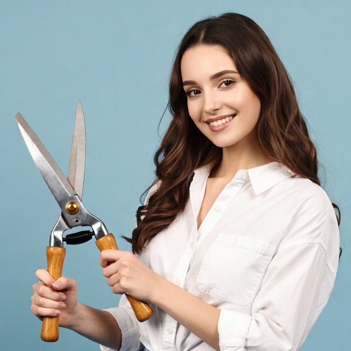 A young woman with long wavy brown hair smiles while holding large pruning shears with wooden handles. She wears a white button-up shirt and stands against a solid blue background. Her hands grip the shears firmly in front of her.