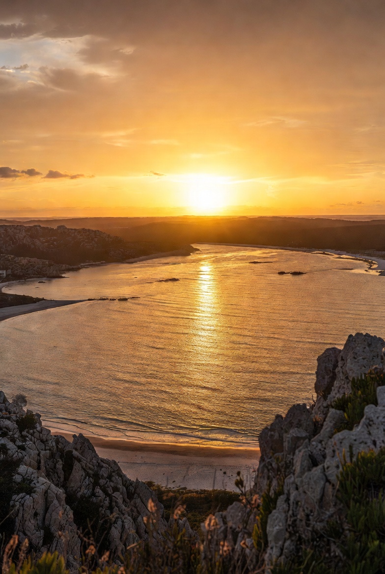A vibrant orange sunset illuminates a serene bay with calm waters reflecting the sun's glow. White sandy beaches curve around the shoreline, flanked by rugged rocky cliffs covered in sparse vegetation. Hilly landscapes and distant buildings frame the horizon under a partly cloudy sky.