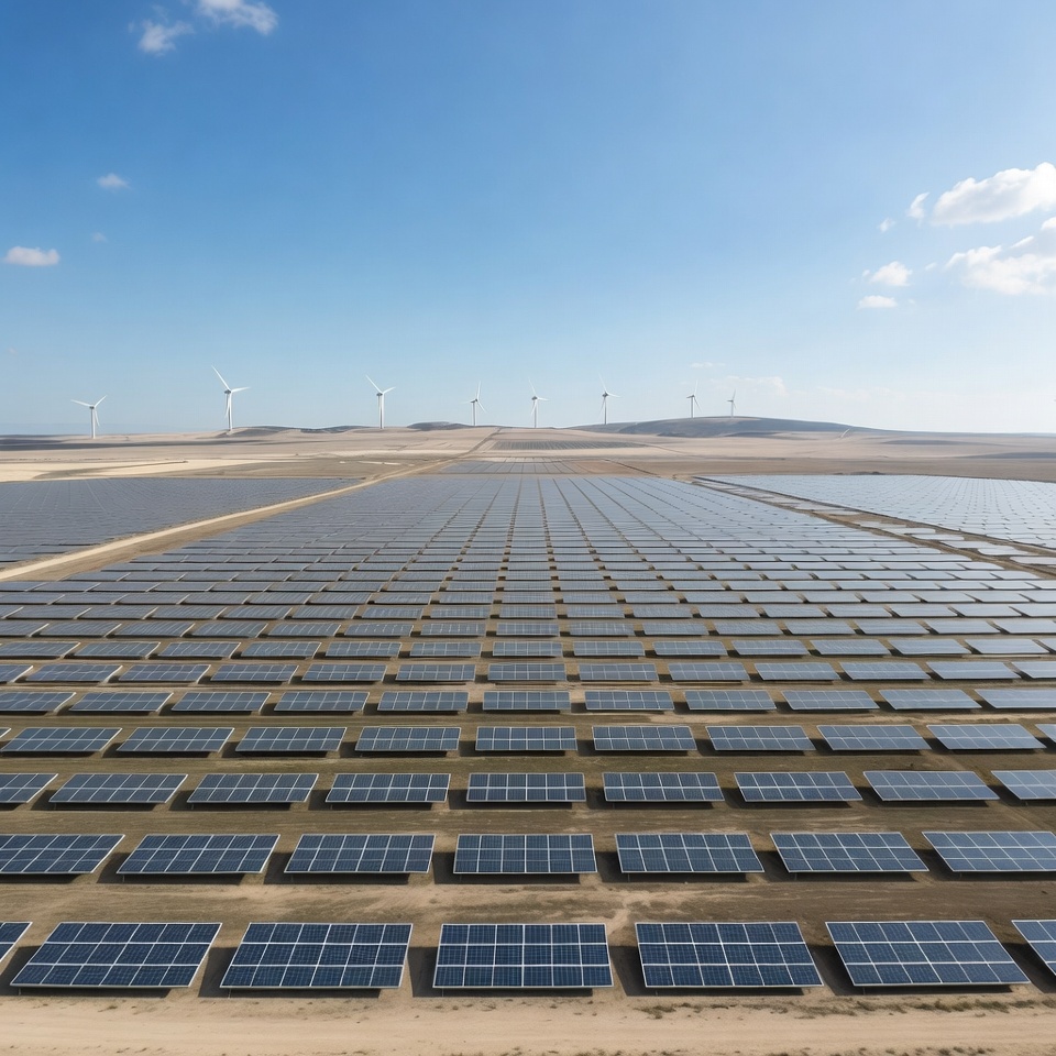 Aerial view of a massive solar panel farm stretches across a flat desert landscape under a clear blue sky. Rows of dark photovoltaic panels are neatly arranged in a grid pattern. Wind turbines are visible on distant hills.