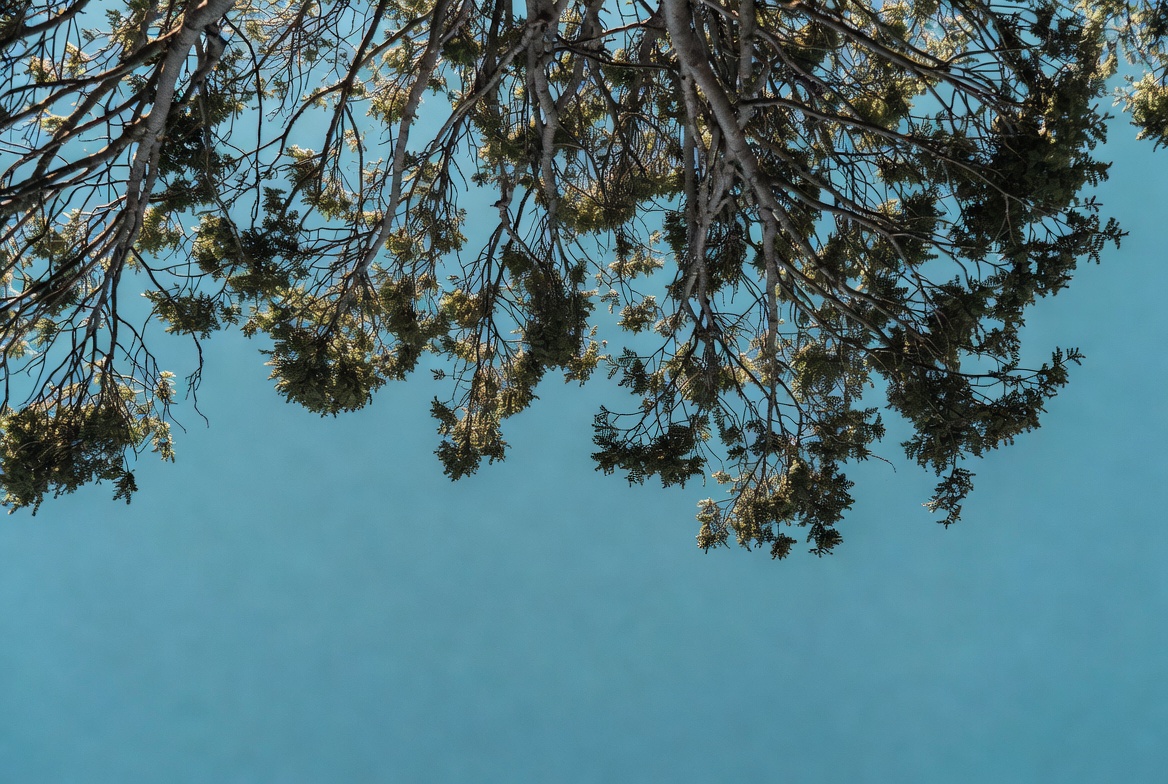 blue sky, branches, conifer, evergreen, foliage, forest canopy, green needles, natural light, nature, outdoors, pine needles, sky background, sunny day, tree branches, trees, pine tree