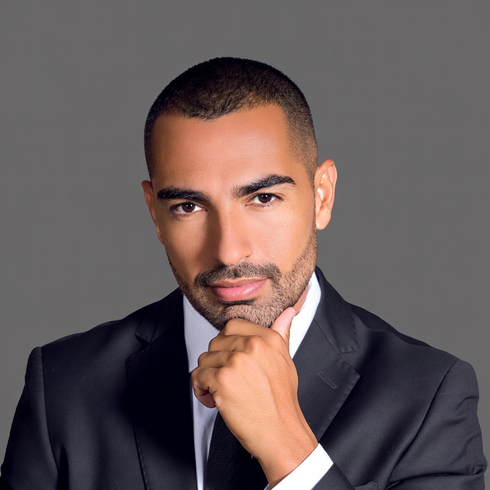 African-American, Middle Eastern, beard, black suit, business attire, close-up, confident, dark hair, formal wear, gray background, hand on chin, headshot, male, portrait, professional, serious expression, short hair, studio portrait, suit, touching chin, trimmed beard, white shirt, man