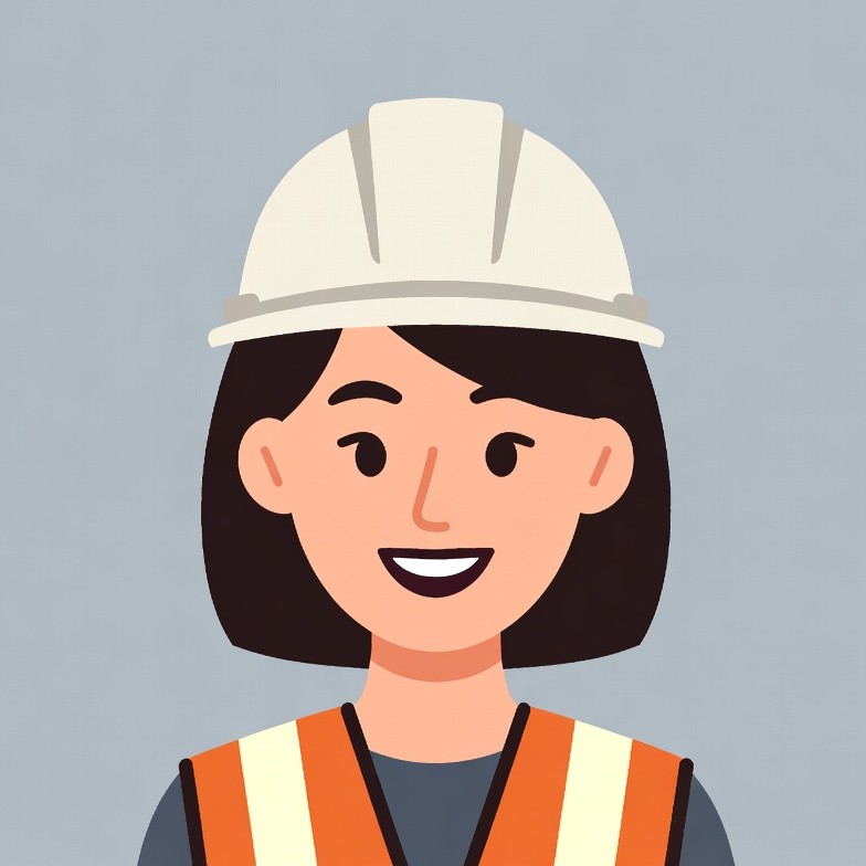 A cartoon illustration of a smiling Asian woman wearing a white hard hat and orange safety vest over a gray shirt. She has short black hair, rosy cheeks, and a friendly expression with wide eyes and a big grin. The figure is centered on a plain light gray background.