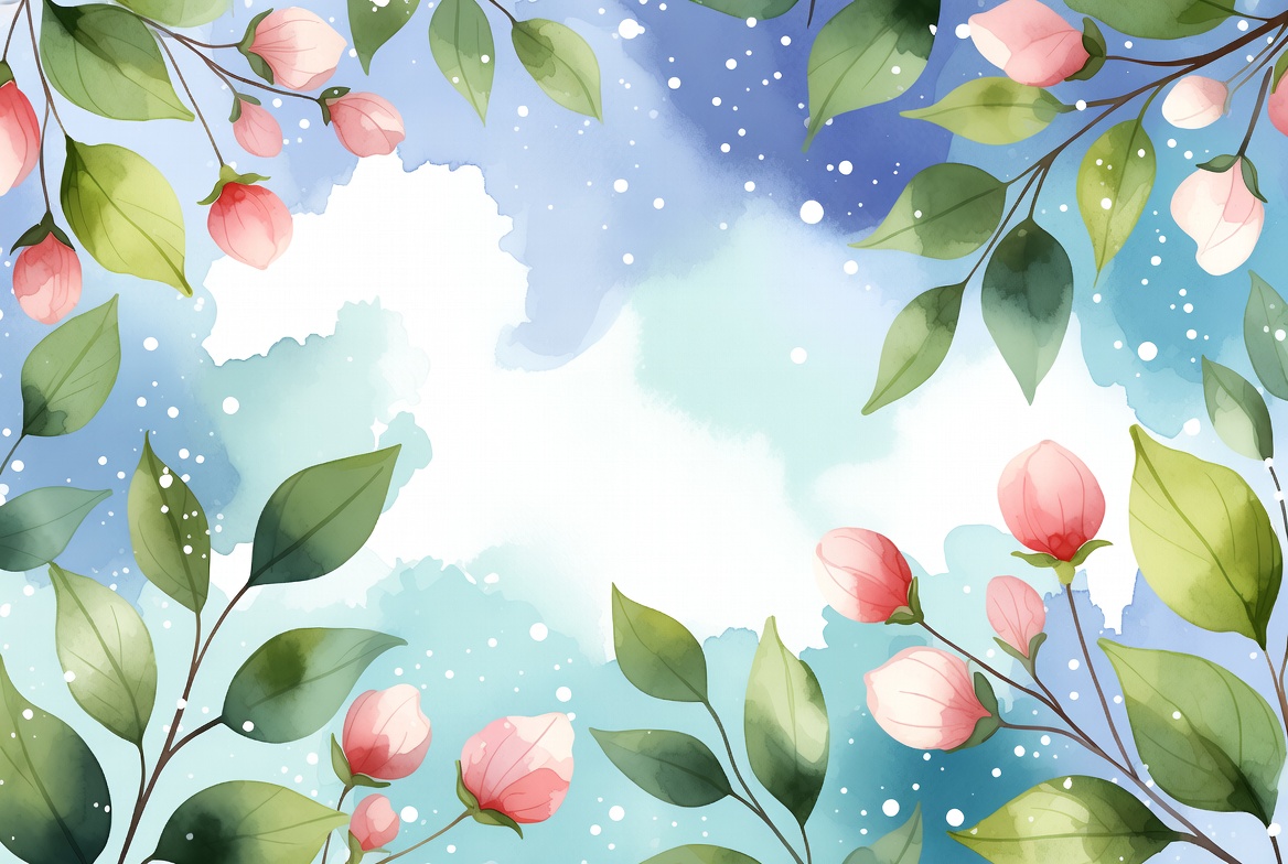 Watercolor illustration features clusters of pink flowers and green leaves arranged across a dreamy blue background with scattered white stars. The delicate buds and broad leaves frame a central white space. Soft gradients and artistic brush strokes create a whimsical floral design.