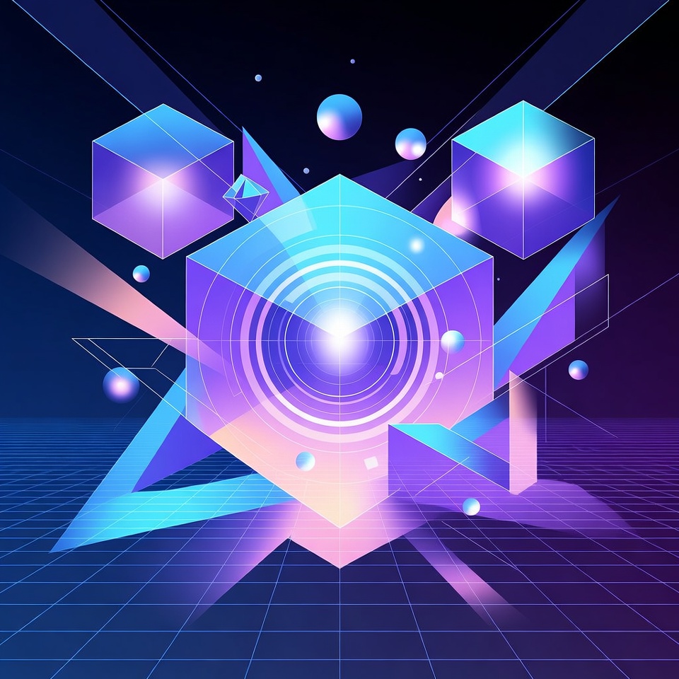3D cubes, blue grid, cyan accents, cyberpunk, digital illustration, floating objects, futuristic design, geometric shapes, glowing center, isolated background, light rays, magenta shapes, neon lights, purple cube, purple hues, pyramids, spheres, synthwave, vibrant colors, abstract art