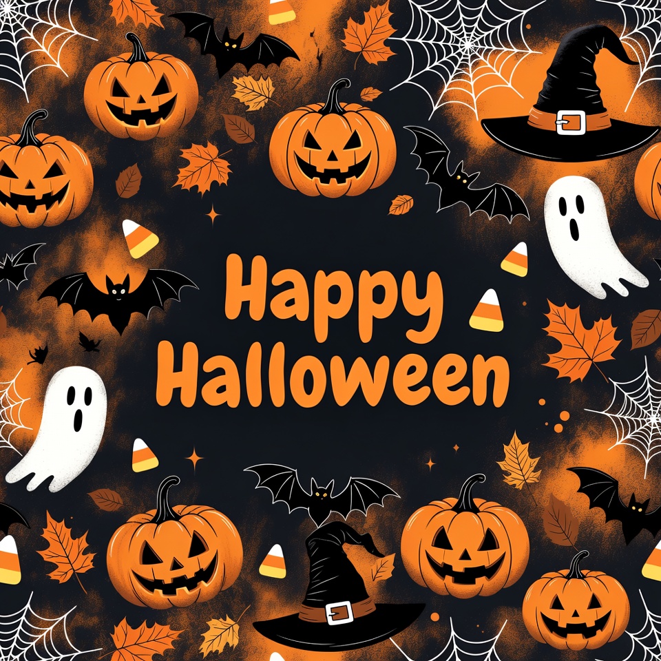 A vibrant Halloween illustration features orange jack-o'-lanterns, black bats, ghosts, witch hats, spider webs, and candy corn scattered on a dark background. Bold orange text reads 'Happy Halloween' in the center. Autumn leaves add to the festive spooky design.