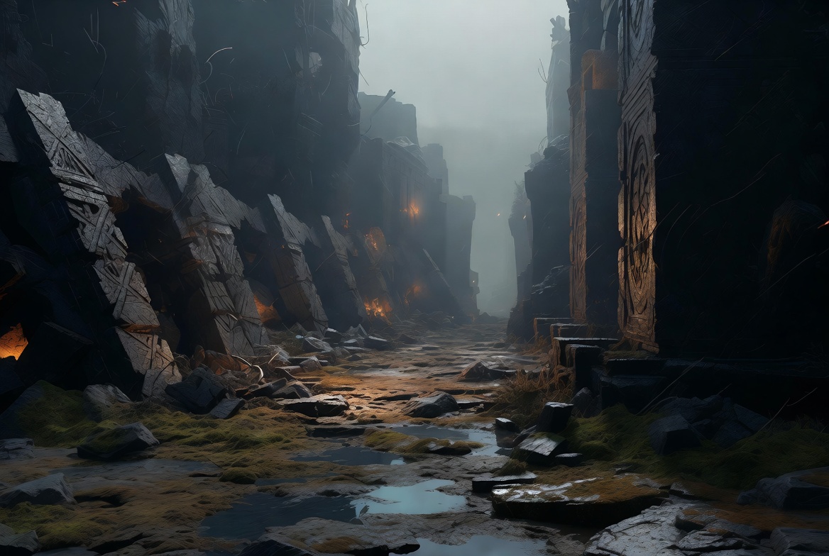 abandoned city, ancient architecture, atmospheric art, atmospheric fog, carved stones, dark fantasy, digital art, dim lighting, epic scenery, fantasy landscape, fantasy ruins, foggy atmosphere, foggy street, glowing embers, misty alleyway, misty path, mystical alley, narrow path, orange lights, puddles, rocky ground, rugged terrain, ruined walls, ruins landscape, stone carvings, stone debris, stone walls, towering structures, ancient ruins