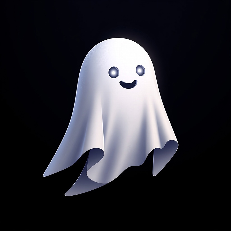 A cute white ghost with large glowing eyes and a cheerful smile floats against a black background. The ghost features a flowing sheet-like body with smooth, rounded edges and subtle shading for a 3D effect. It is rendered in a vibrant cartoon style.