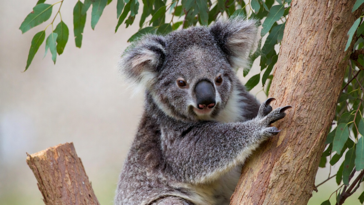animal, australia, black nose, branches, claws, cute koala, eucalyptus tree, fluffy fur, gray fur, green leaves, isolated background, koala bear, marsupial, tree trunk, wildlife, koala