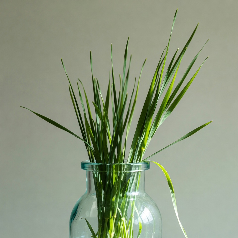 A bunch of vibrant green grass blades stands upright in a clear glass vase. The vase is placed on a plain gray background, highlighting the fresh foliage. The grass appears lush and freshly cut.