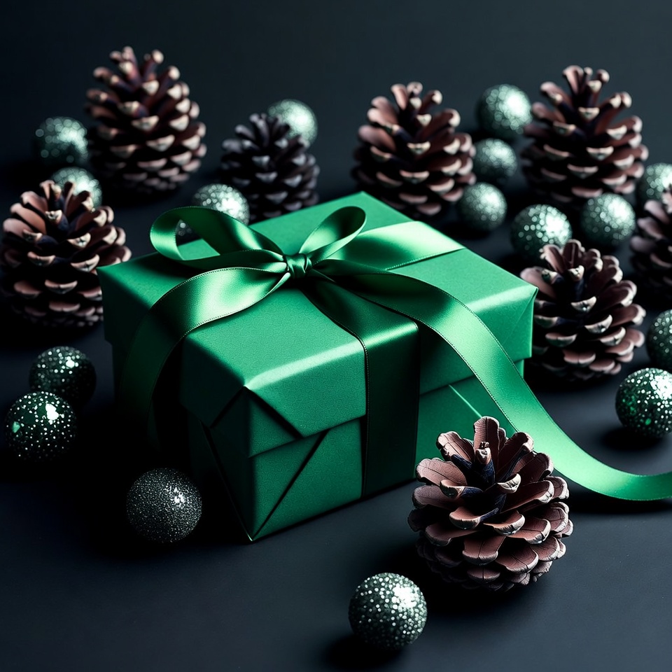 A shiny green gift box tied with a large green satin ribbon sits centered on a dark background. It is surrounded by clusters of brown pine cones and scattered green and silver Christmas ornaments. The composition features elegant holiday decorations in emerald tones.