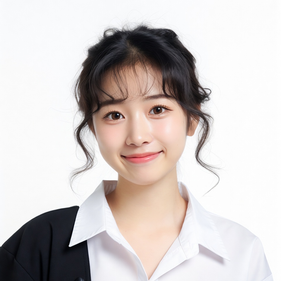 A young Asian woman with long black hair styled in loose bangs smiles warmly at the camera. She wears a black blazer over a white collared shirt. The portrait is set against a plain white background.