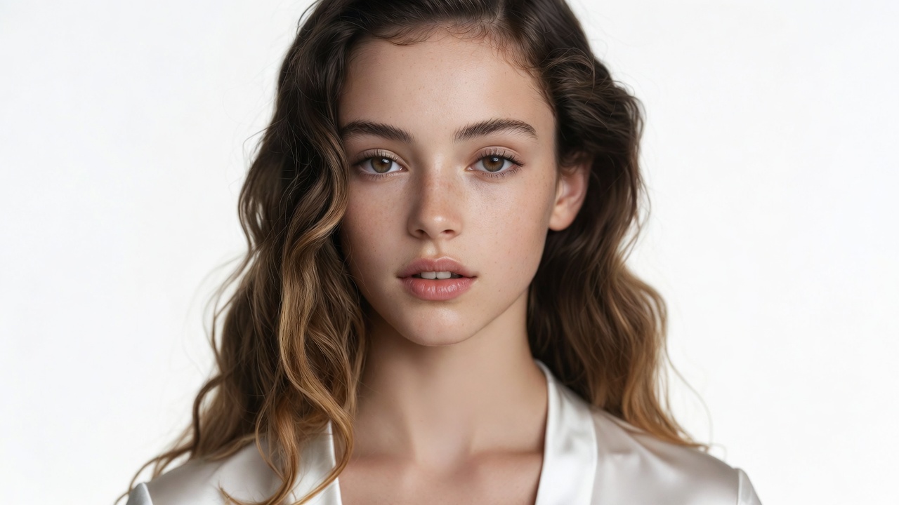 A young woman with long wavy brown hair and hazel eyes gazes directly at the camera. She has fair skin, subtle makeup, and glossy lips. She wears a white satin blouse against a plain white background.