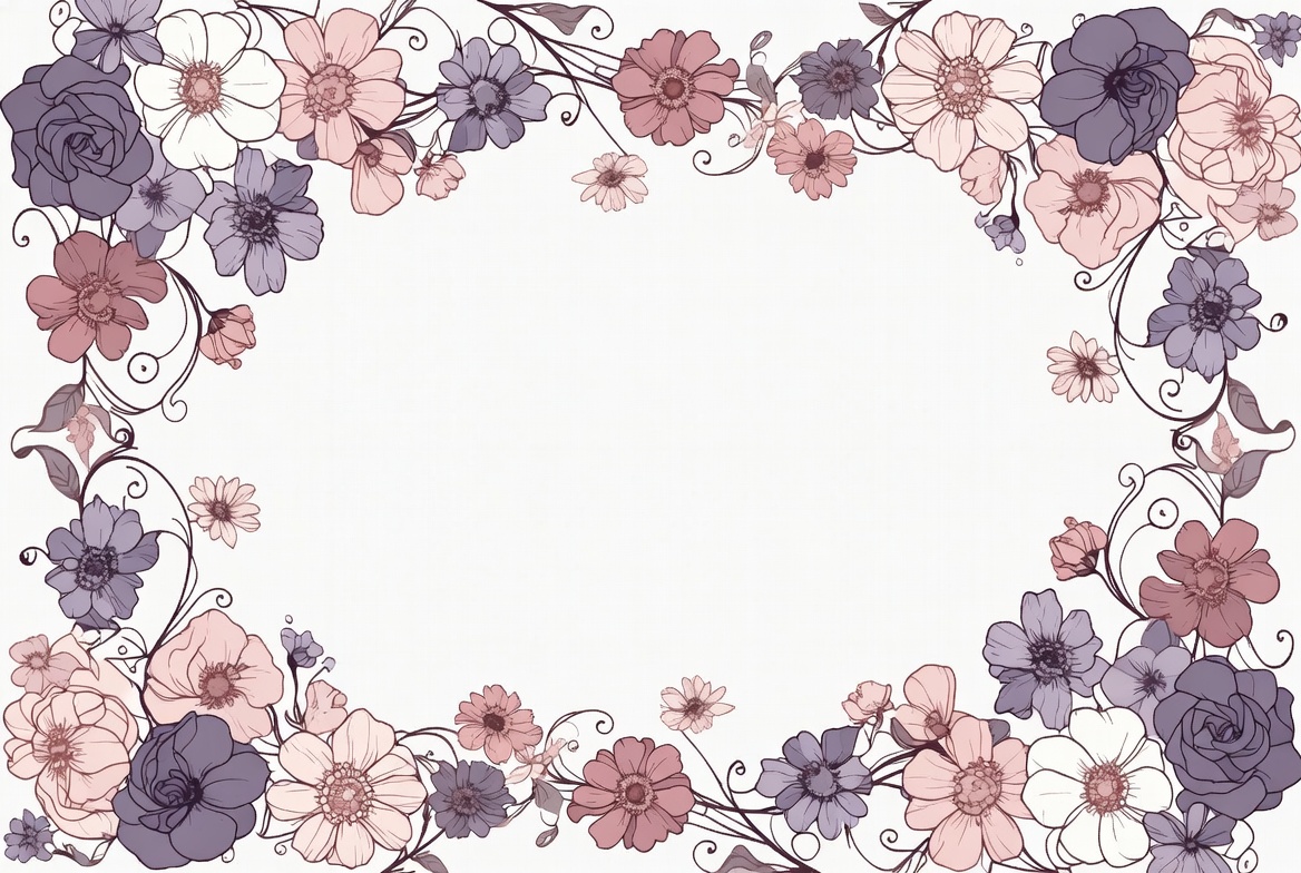 A delicate line art illustration features a rectangular frame made of various flowers in shades of pink, purple, and white. The flowers include roses, daisies, and others with vines and leaves outlining a central white empty space. The design has an elegant, watercolor-style outline on an isolated background.