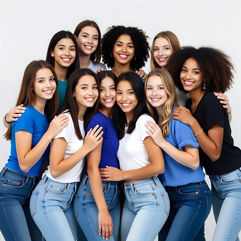 A diverse group of ten young women stands closely together on a white background, smiling happily at the camera. They wear casual t-shirts in white, blue, and black paired with blue jeans, with arms around each other in a group embrace. The women represent various ethnicities including White, African-American, Asian, and multiracial features.