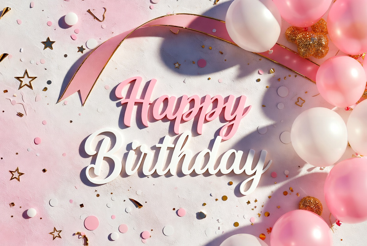 3D letters, balloons cluster, birthday card, birthday sign, birthday text, celebration, confetti, festive background, flat lay, gold stars, gradient background, greeting sign, holiday decor, isolated background, party decorations, party elements, pink balloons, pink gradient, pink ribbon, pink theme, ribbon bow, shadows, star confetti, white balloons, white text, happy birthday