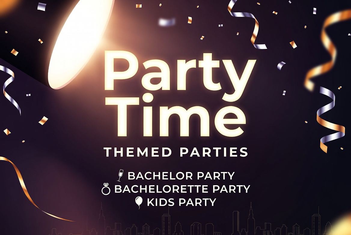 A vibrant graphic illustration features the text 'Party Time' in large white letters with 'Themed Parties' below on a dark background. Spotlights shine brightly with golden confetti and ribbons scattered around. It lists bachelor party, bachelorette party, and kids party icons including microphone, ring, and balloon.